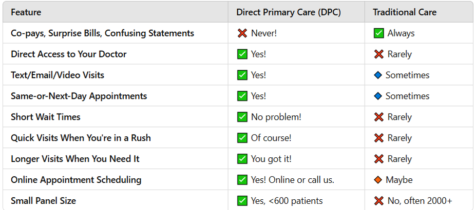 DPC es un modelo de atención médica que se enfoca en la relación entre medico y paciente y que provee atención de alta calidad que es conveniente, accesible y responsiva. Las clínicas de DPC no facturan a través del seguro y, por lo tanto, eliminan las restricciones, la confusión en torno a la facturación y los aumentos de precios que vienen con el seguro. El modelo DPC tiene el beneficio de una atención integral con una gama completa de servicios personalizados a través de una tarifa de membresía baja.